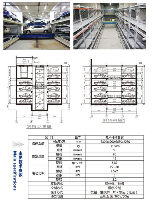 采用在同一层上用搬运台车或起重机平面移动,或使载车板平面横移实现存取停放车辆,亦可用搬运台车和升降机配合实现多层平面移动存取停放车辆。此种类型的设备大多为多层平面移动类,这种车库可以建成大型化、自动化的车库、容车密度大、存(取)车快捷,适宜建在大型住宅周围的地下,对机场、车站、繁华商业中心区、体育馆、办公楼等区域也适合。尤其是巷道长度长、层数不多的地下大容量存车库,用这种设备的技术经济性较好。